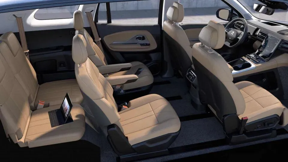等开上高速,他媳妇和孩子可就享福了。他闺女直接在半躺的副驾女王座椅上睡着了,带加热通风按摩,还能一键舒展成接近平躺的模式。第二排是两个独立的航空座椅,他老婆和丈母娘坐着,一个用折叠桌板处理邮件,一个戴着耳机通过头枕音响看剧,互不打扰。我坐在第三排,空间比想象中宽敞不少,长途也不会憋屈。整个车厢安静得只有细微的背景音乐,他儿子甚至用后舱娱乐屏完成了半套线上作业。这哪是坐车,分明是把家里的客厅、书房、影音室全搬上了路。