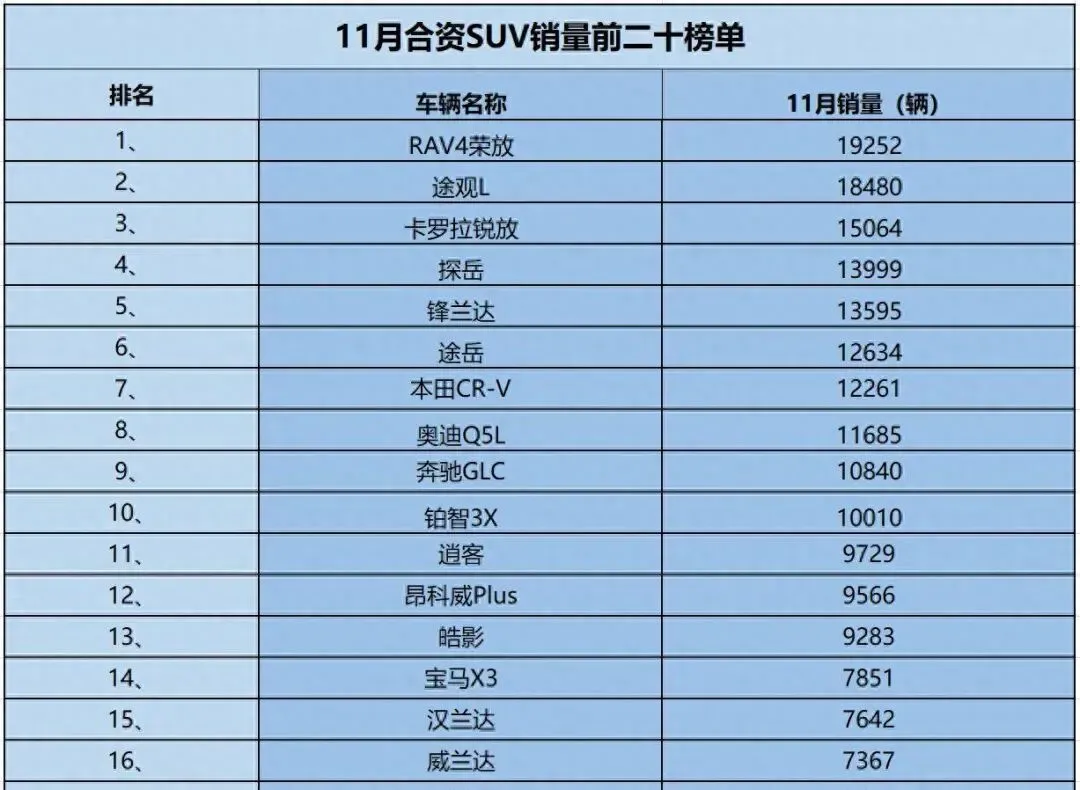 最新11月合资SUV销量榜一出,不少网友直呼:“丰田赢麻了,大众哭麻了。”