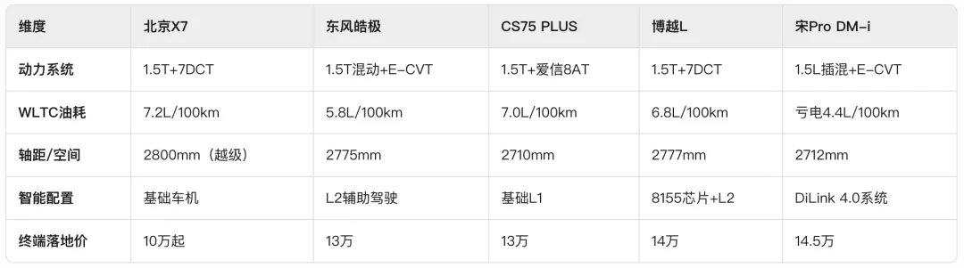 根据大飙车拆解数据及实测对比,针对10-15万预算的国产紧凑型SUV,结合北京X7、东风皓极的核心表现及同价位高竞争力车型,深度解析如下: