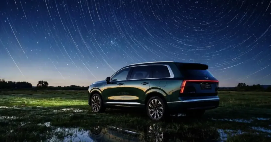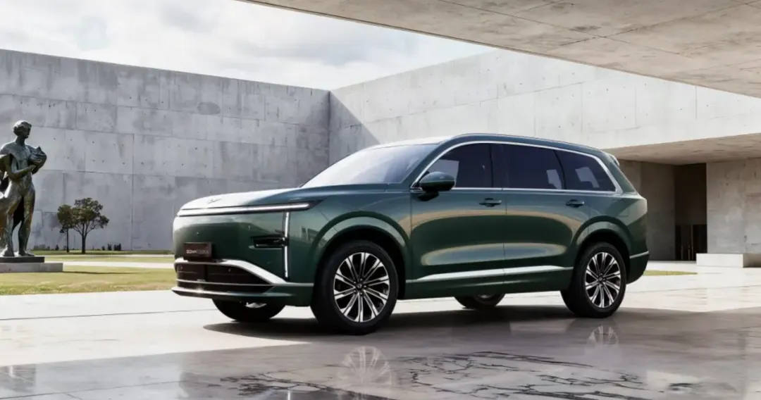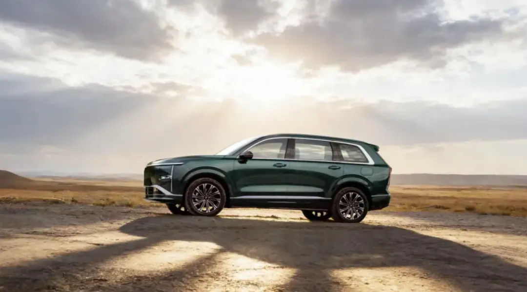 外观上,它用了贯穿式的前后灯组,灯带两侧向下延伸,形成一个有点像“门”字的造型,辨识度挺高。车门拉手是实体式的,车窗边框加了镀铬装饰,车顶和腰线都比较平直,整体看起来气场很足。