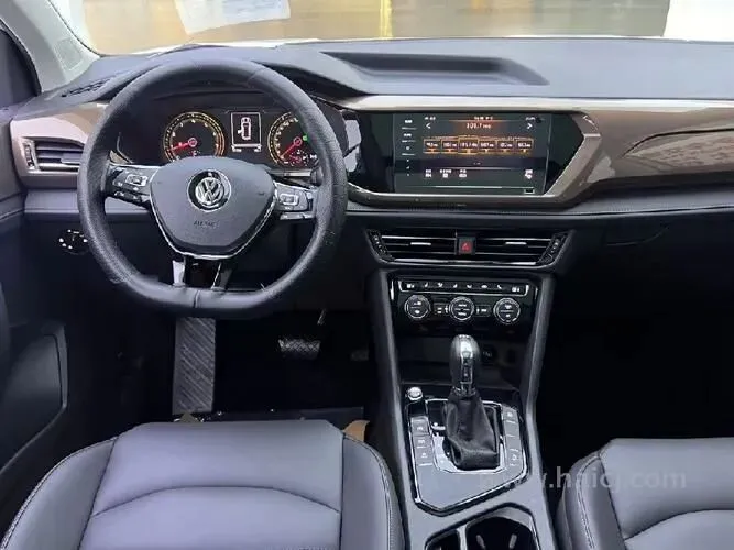 然后咱看看内饰,我进来给大家感受一下,这个方向盘握着手感还行,皮质摸着不算特别软但是也不硬,嗯然后中控这个T型布局,标准的大众味儿,悬浮式的屏幕,黑色内饰为主。我敲一下这个地方,喏就这个位置,是硬塑料,但是这个价位你也不能要求太多对吧。座椅是皮的包裹还可以,带座椅加热,这个冬天用着是真舒服。
