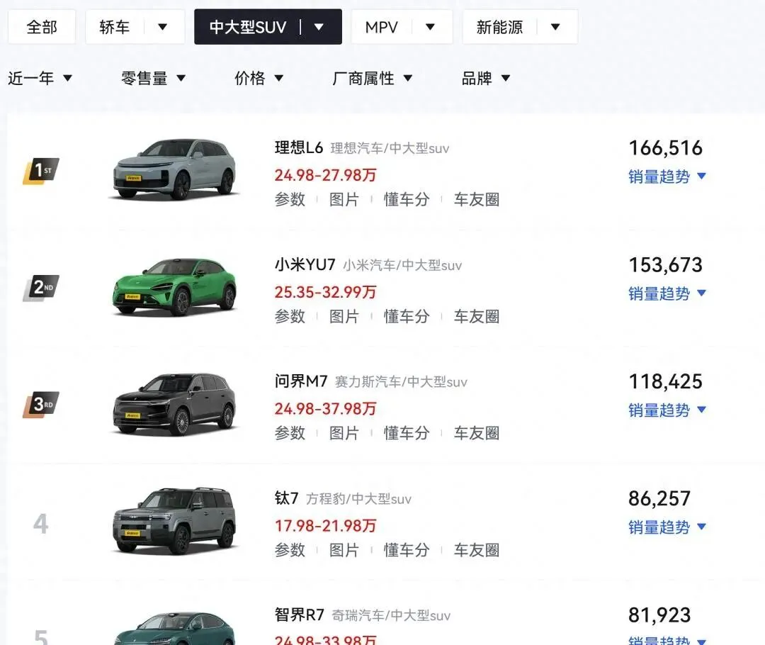 2025年中大型SUV销量前五名出来了,大家都在看,市场格局变了,这事影响很大,机构发布了去年12月的单车型销量数据,还有全年的汇总,来源很权威,数据不会假,销量榜单说明了消费者喜欢什么,什么技术受欢迎,竞争有多激烈,这很重要。
