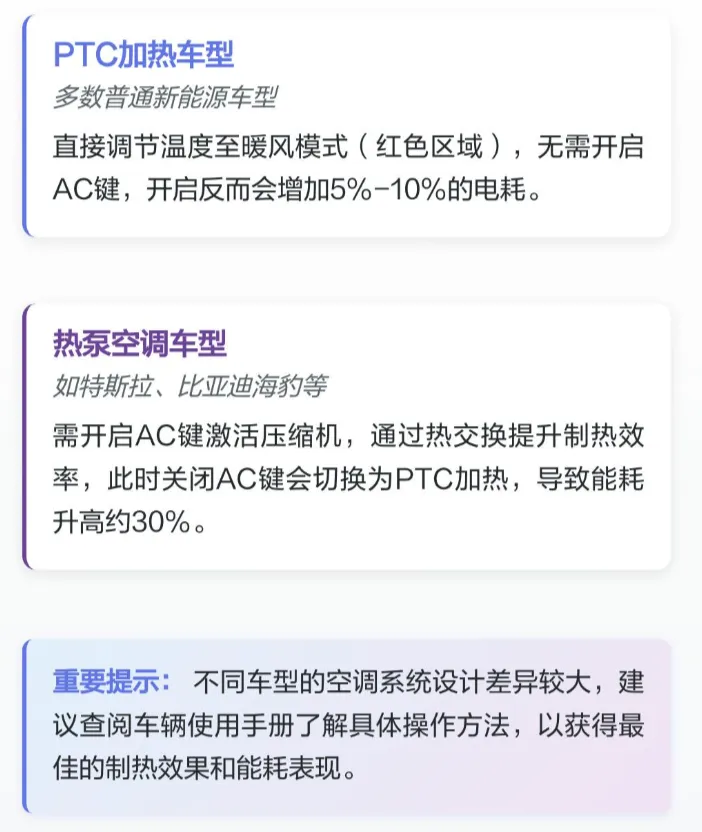 ✅ 只是想取暖(车窗不雾):开暖风,不开AC(PTC用户);热泵用户根据车型决定是否开AC;