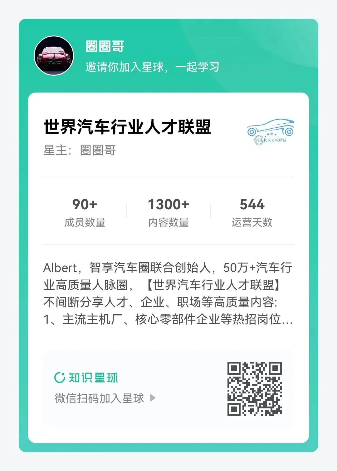 3、星球实行会员制,现价199元。商务合作或者进入世界汽车行业人才联盟微信群,请联系圈圈哥微信GSAuto0001,车企或者头部零部件企业招聘老师可以申请免费加入