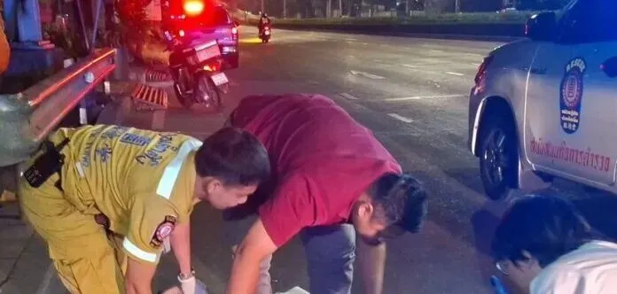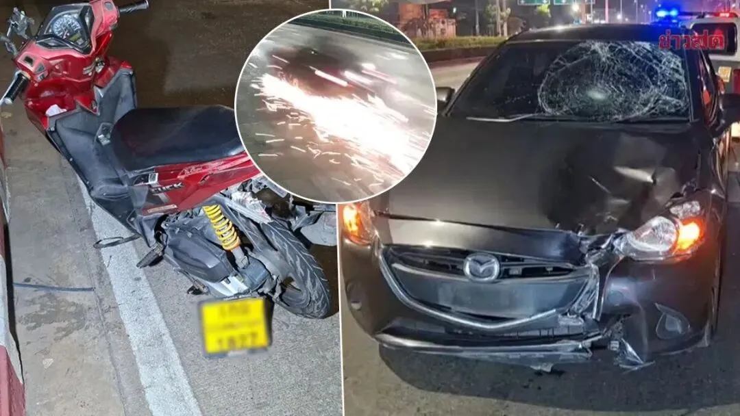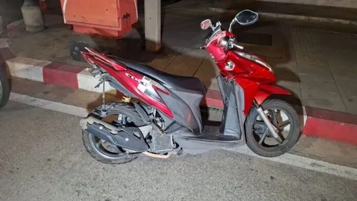 在大约10米外,发现一辆红色本田摩托车,曼谷黄牌,翻倒在地,车尾有碰撞痕迹。另有一名男性伤者,为摩托车驾驶员,名为提拉蓬,48岁,因受伤已被送往附近医院。