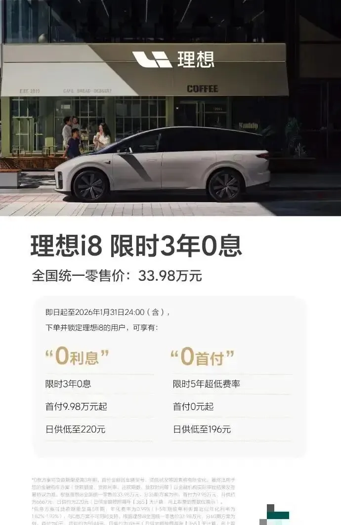 理想汽车这波操作,简直把“降维打击”玩成了艺术。1月9号起,锁单i8的用户能白嫖3年0息,省下1.8万利息;首付9.98万起,日供220,相当于每天一杯奶茶钱。更狠的是「0首付」政策——首付0元起,日供低至196元,5年超低费率。你没看错,真能「零首付提车」,连月供都比喝咖啡还便宜。