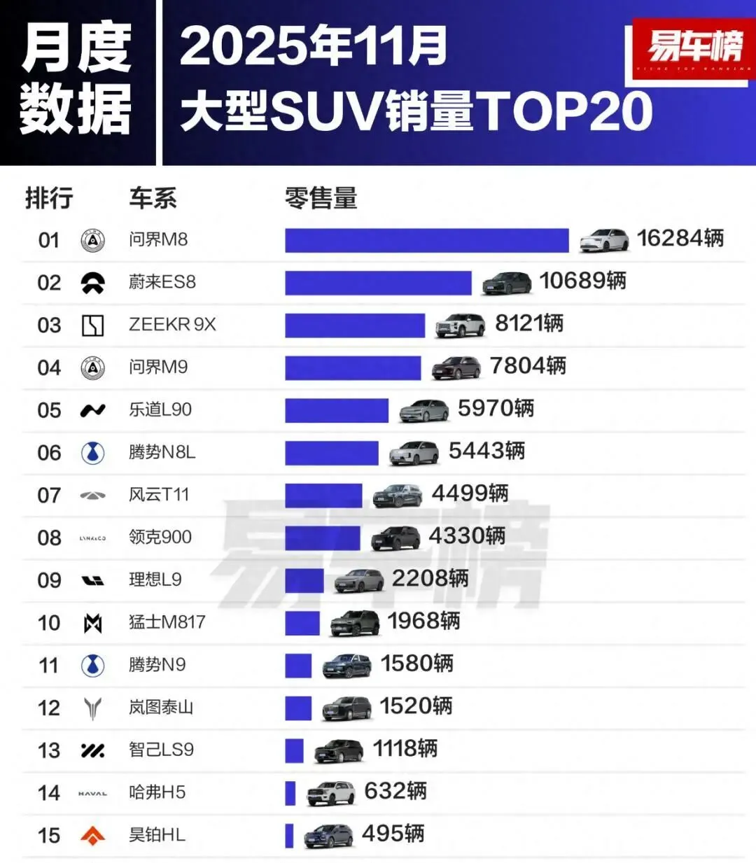 蔚来ES8、极氪9X双双上位,问界M9直接掉出前三。