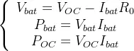 其中Vbat、VOC、Ibat、R0、Pbat和POC分别为电池的电压、开路电压、电流、内阻、输出功率和化学功率。 VOC 和 R0 都是电池充电状态 (SOC) 的函数。因此,电池电流 Ibat 由下式给出:
