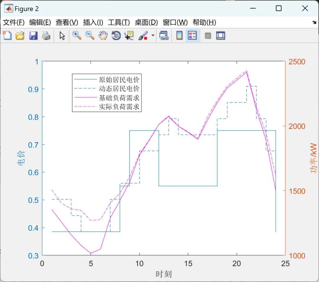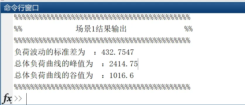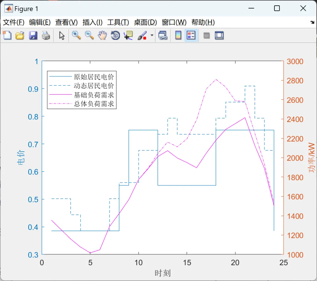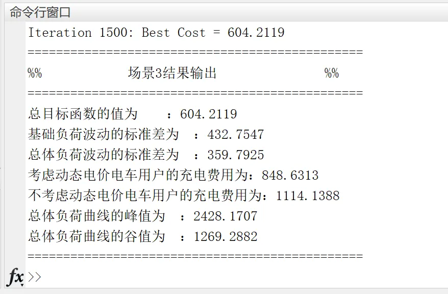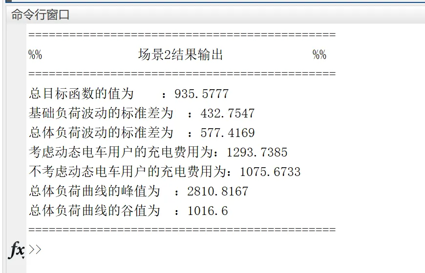disp('===============================================')disp('%% 场景3结果输出 %%')disp('===============================================')disp(['总目标函数的值为 :',num2str(fun)])disp(['基础负荷波动的标准差为 :',num2str(C_1_0)])disp(['总体负荷波动的标准差为 :',num2str(C_1)])disp(['考虑动态电价电车用户的充电费用为:',num2str(C_2)])disp(['不考虑动态电价电车用户的充电费用为:',num2str(C_2_1)])disp(['总体负荷曲线的峰值为 :',num2str(max(P_L_act*1000))])disp(['总体负荷曲线的谷值为 :',num2str(min(P_L_act*1000))])