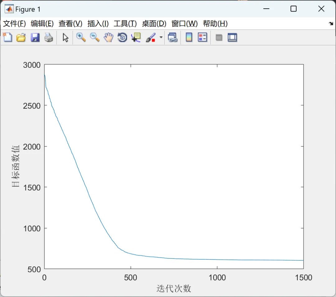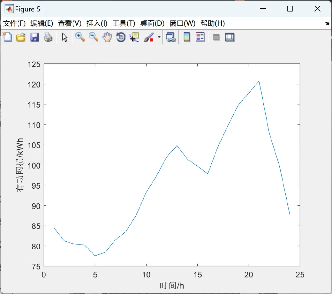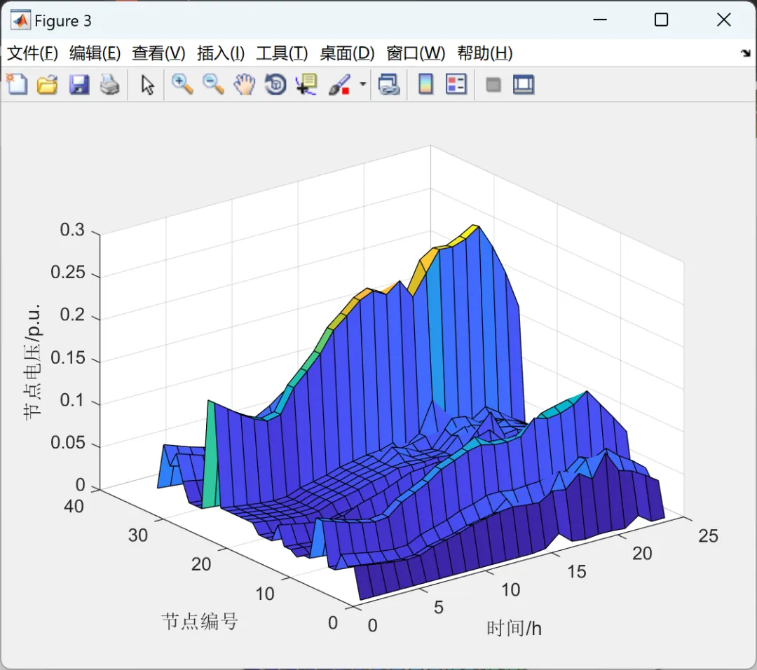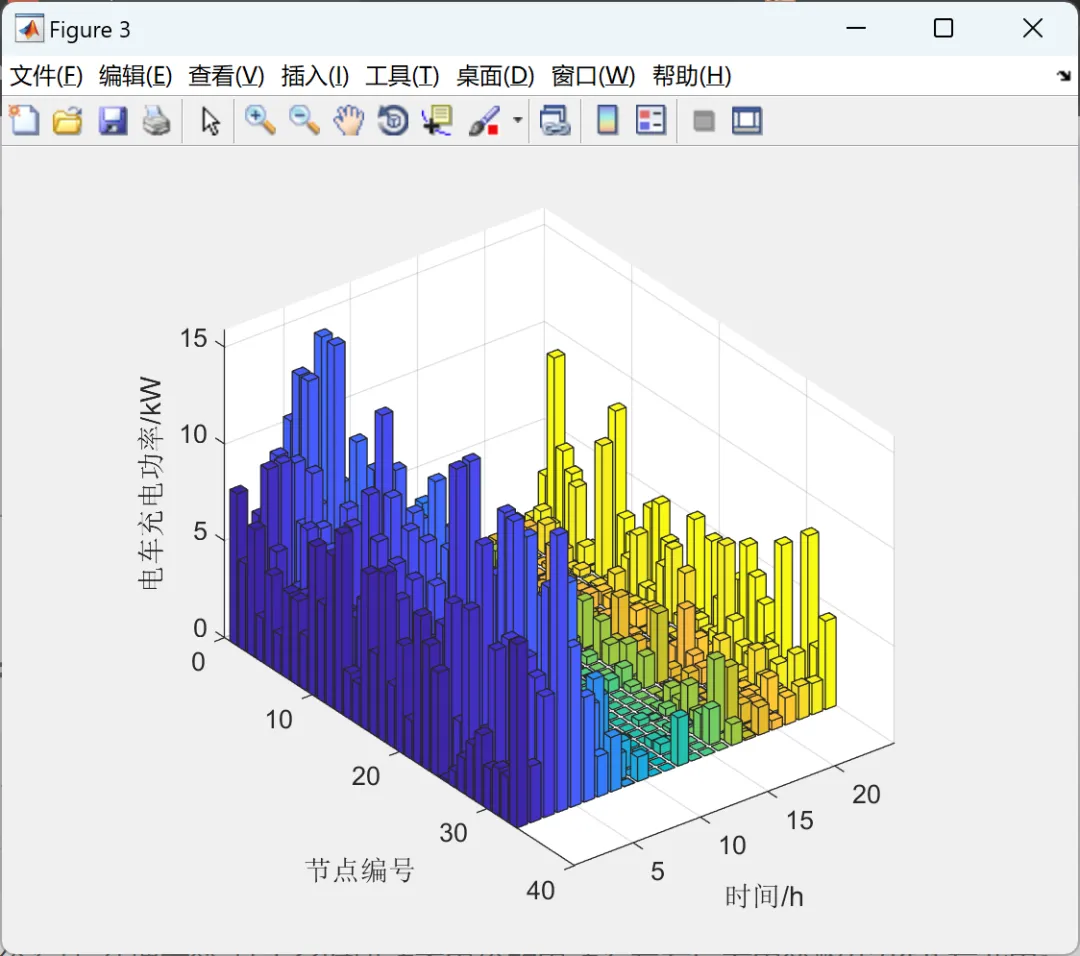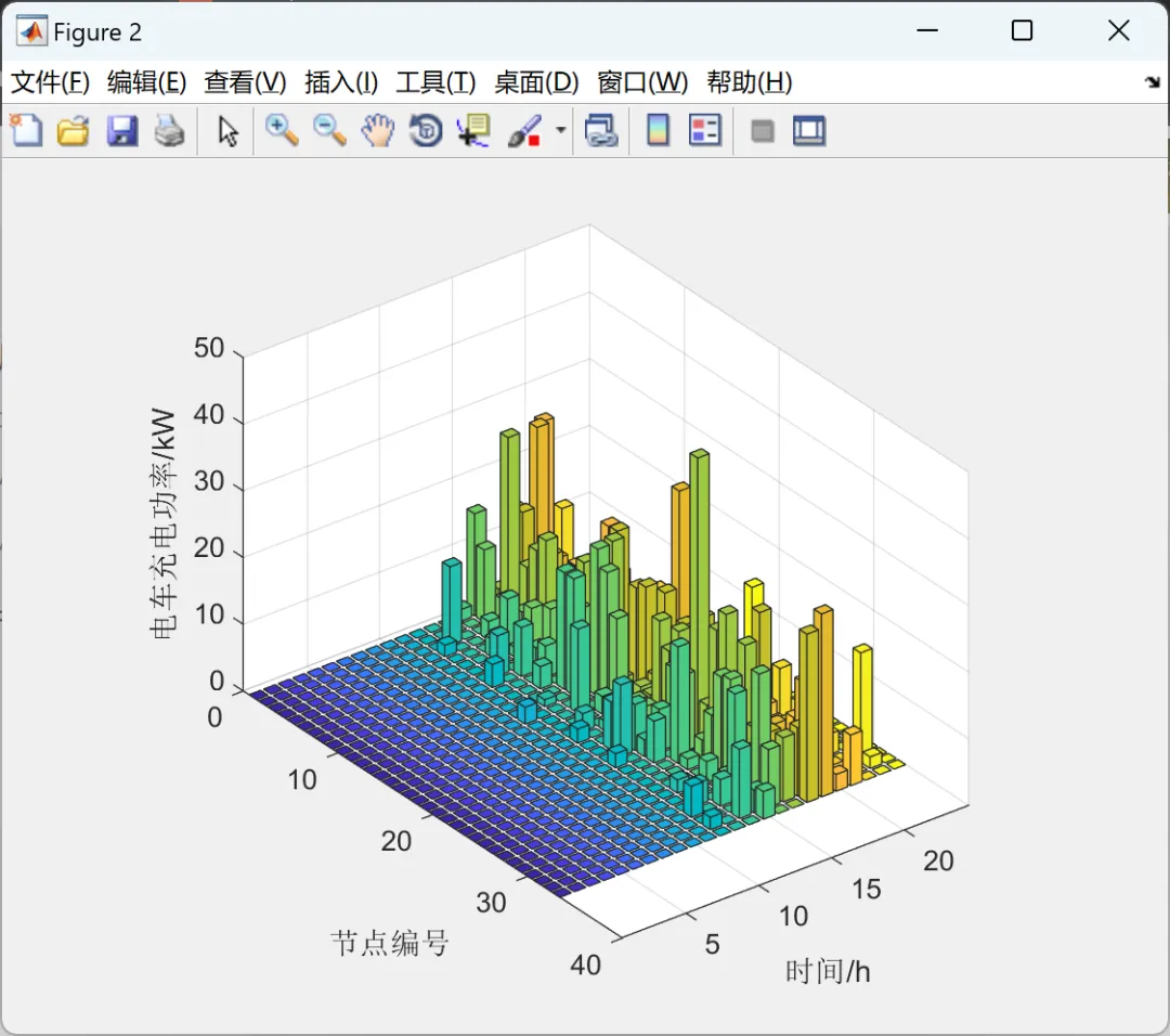 %% 粒子群算法优化求解MaxIt=1500; % 迭代次数nPop=650; % 种群规模nVar = sum(sum(Tap));% 决策变量数量nVar1 = [0; sum(Tap,2)];% 各个电动车的决策变量数量(实际上就是每辆车的可调度时段数)VarMin = zeros(1,nVar);% 决策变量下限VarMax = EV_features.S_char*ones(1,nVar);% 决策变量上限% 调用粒子群算法进行优化求解[bestPosition, fitValue ,BestCost] = PSOFUN(@objective2,nVar,VarMin,VarMax,MaxIt,nPop);% 变量还原(把原本 电动车数*调度时段数 的决策变量转变为 电动车数*24h 的电动车逐时充电功率矩阵,方便后续计算)Load_EV_tran = zeros(car_number,48);for i=1:car_number Load_EV_tran(i,EV_features.Starttime(i):EV_features.Endtime(i)+24)=bestPosition(sum(nVar1(1:i))+1:sum(nVar1(1:i+1)));endLoad_EV = (Load_EV_tran(:,1:24)+Load_EV_tran(:,25:48));% 计算各节点电动汽车充电需求P_L_EV = zeros(33,24);for i=1:33 P_L_EV(i,:) = sum(Load_EV((i-1)*car_number/33+1:(i-1)*car_number/33+car_number/33,:))/1000;end% 计算实际的总体负荷mpc=case33bw;P_L_act = sum(Power_load.*mpc.bus(:,3))+sum(P_L_EV);% 验证是否满足潮流约束并计算最优潮流V = zeros(33,24);% 逐时记录电压P_loss = zeros(1,24);% 逐时记录网损for t=1:T mpc=case33bw; mpc.bus(:,3)=Power_load(t).*mpc.bus(:,3);% 当前时刻各节点基础负荷 mpc.bus(:,3)=mpc.bus(:,3)+P_L_EV(:,t);% 加上电动汽车充电渡河 [result,sucess]=runopf(mpc,mpoption('OUT_ALL',0,'VERBOSE',0,'PF_ALG',3));% matpower计算最优潮流 V(:,t) = result.bus(:,3);% 当前时刻各节点电压幅值 P_loss(t) = sum(result.branch(:,14)+result.branch(:,16));% 当前时刻系统网损 if sucess == 1% 判断是否满足潮流约束% disp('当前场景满足潮流约束!') elseif sucess == 0 disp('当前场景不满足潮流约束!') endend%% 优化结果可视化[fun,C_1,C_2] = objective2(bestPosition);C_1_0 = sqrt((sum((P_L_base*1000-mean(P_L_base)*1000).^2))/24);C_2_1 = sum(sum(P_EV_0).*csell);