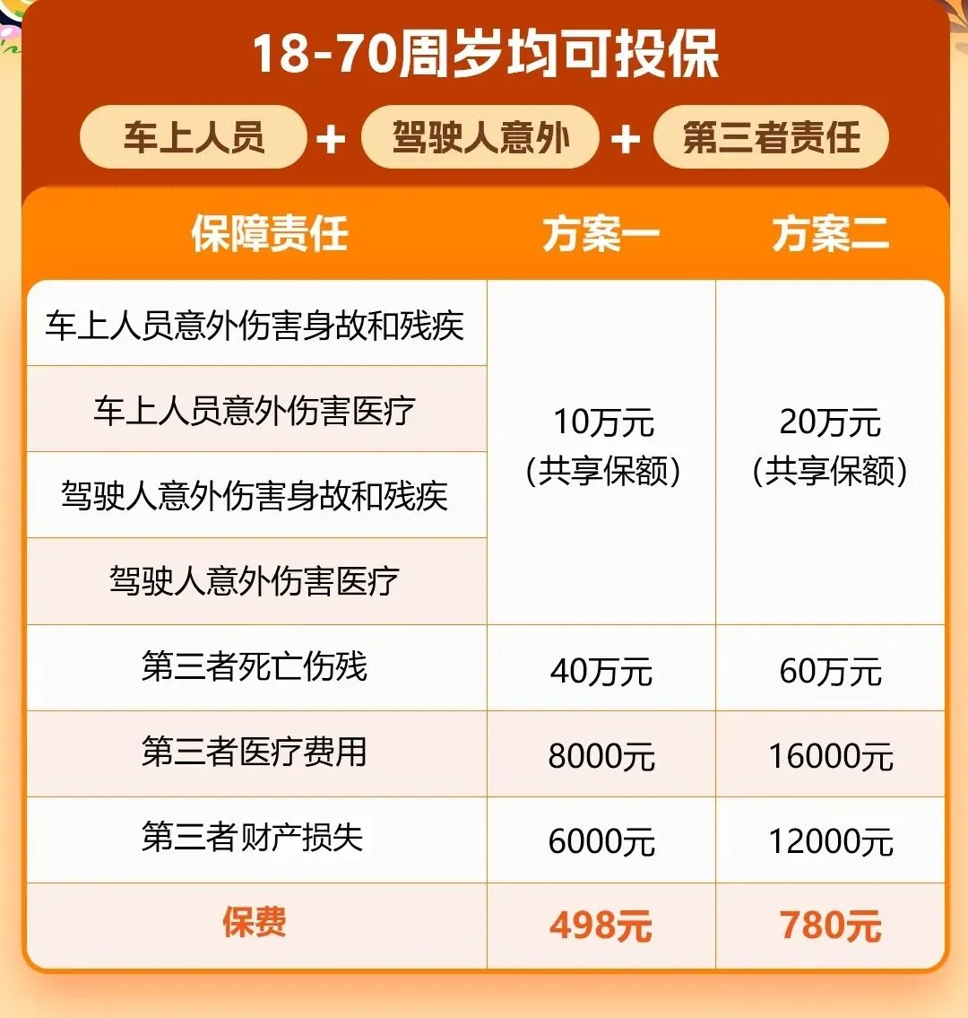 共享保额设计:灵活分配保额,保障更高效;车上人员+驾驶人意外最高共享20万保额,第三者责任最高60万保额。