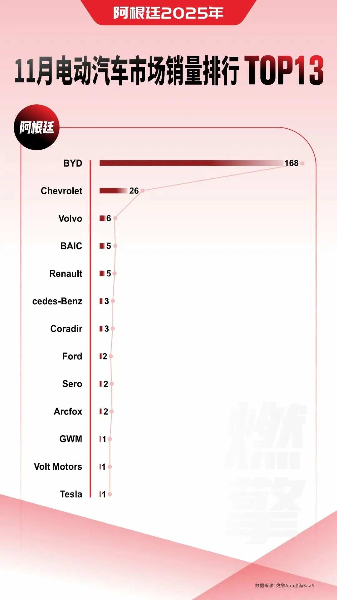 整体而言,榜单中多数品牌月销量不足十辆,这清晰地表明阿根廷电动汽车市场仍处于非常早期的用户教育与市场培育阶段。