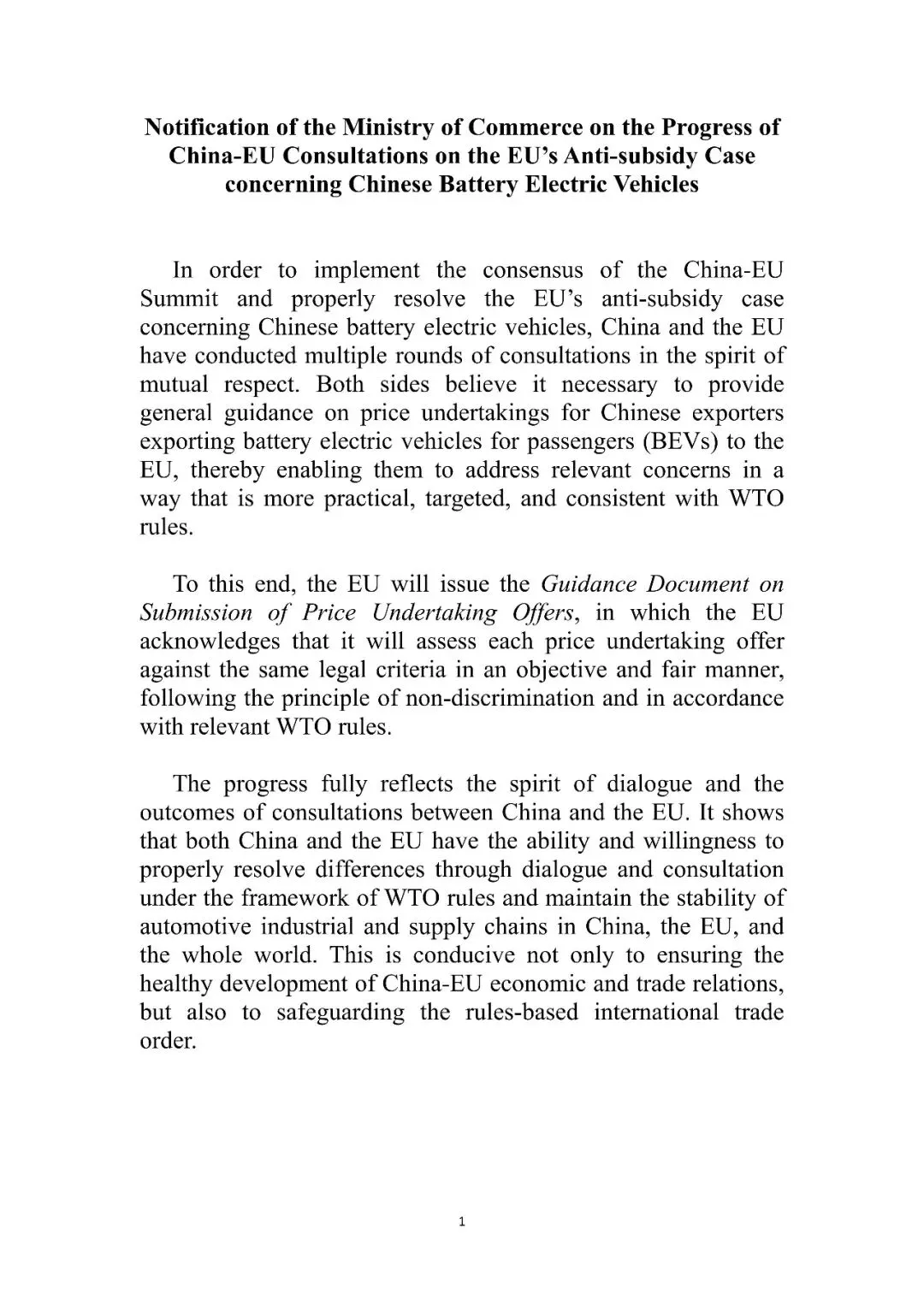 为落实中欧领导人会晤共识,妥善解决欧盟对华电动汽车案,中欧双方本着相互尊重的态度,进行了多轮磋商。双方一致认为,有必要向对欧盟出口纯电动汽车的中国出口商,提供关于价格承诺的通用指导,以便中国出口商可通过更加实用、有针对性且符合世贸组织规则的方式,解决相关关注。