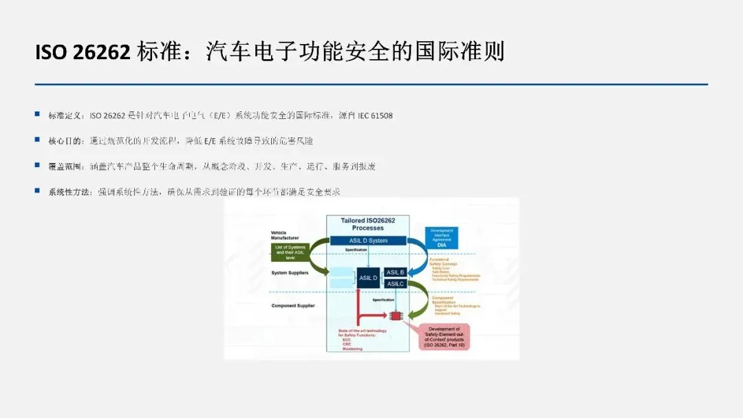 2. ISO 26262 标准提供了系统的功能安全工程方法,从需求分析、设计、实现到测试和验证的全生命周期管理。