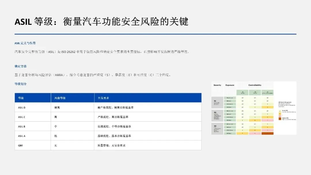 ASIL 等级 | 风险等级 | 典型应用 | 要求严格程度 |