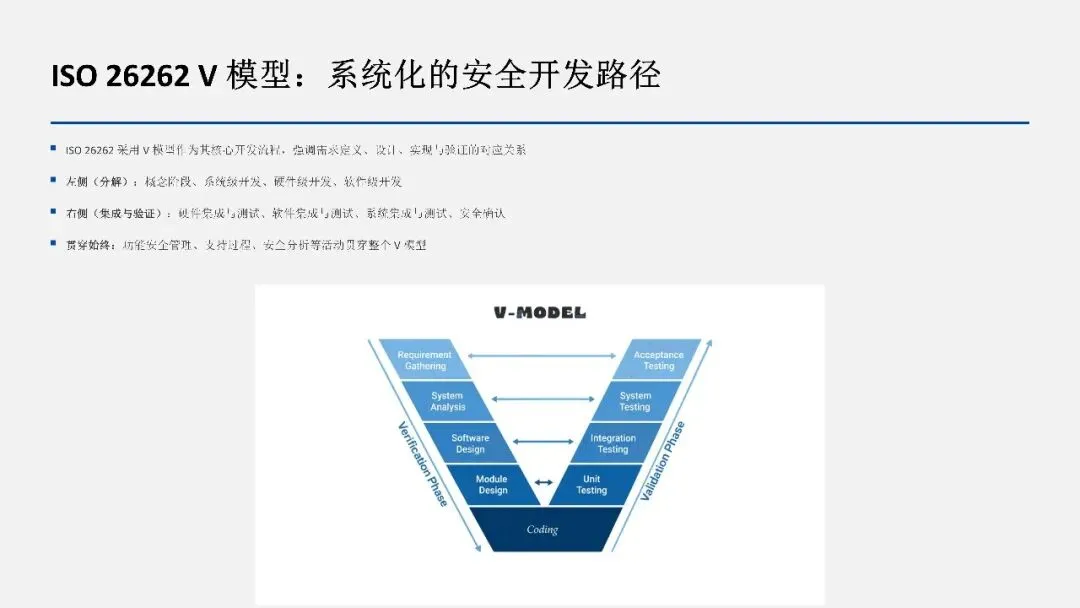 ISO 26262 采用 V 模型作为开发框架,左侧为需求分析和设计阶段,右侧为测试和验证阶段。