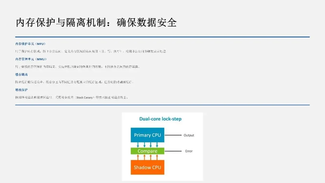 内存保护单元(MPU):定义内存区域的访问权限,检测非法访问。内存管理单元(MMU)提供虚拟内存管理和内存隔离。缓存隔离防止缓存侧信道攻击。