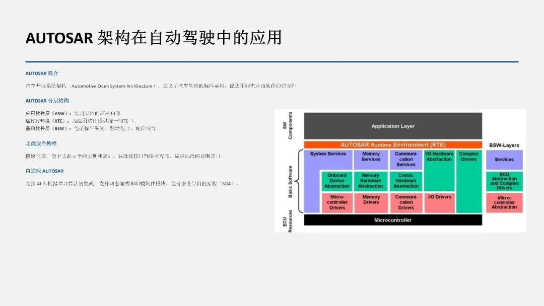 AUTOSAR(汽车开放系统架构)定义了汽车软件的标准架构,促进不同供应商软件的兼容性。
