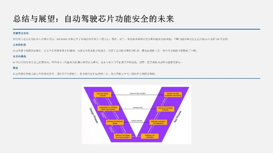 自动驾驶芯片的功能安全将继续演进。通过多学科的协作(芯片设计、软件工程、系统工程、网络安全等)、技术的创新(新工艺、新架构、新算法)和标准的完善(ISO 26262 的更新、新标准的制定),我们将能够为人类的安全出行提供坚实的技术基础。