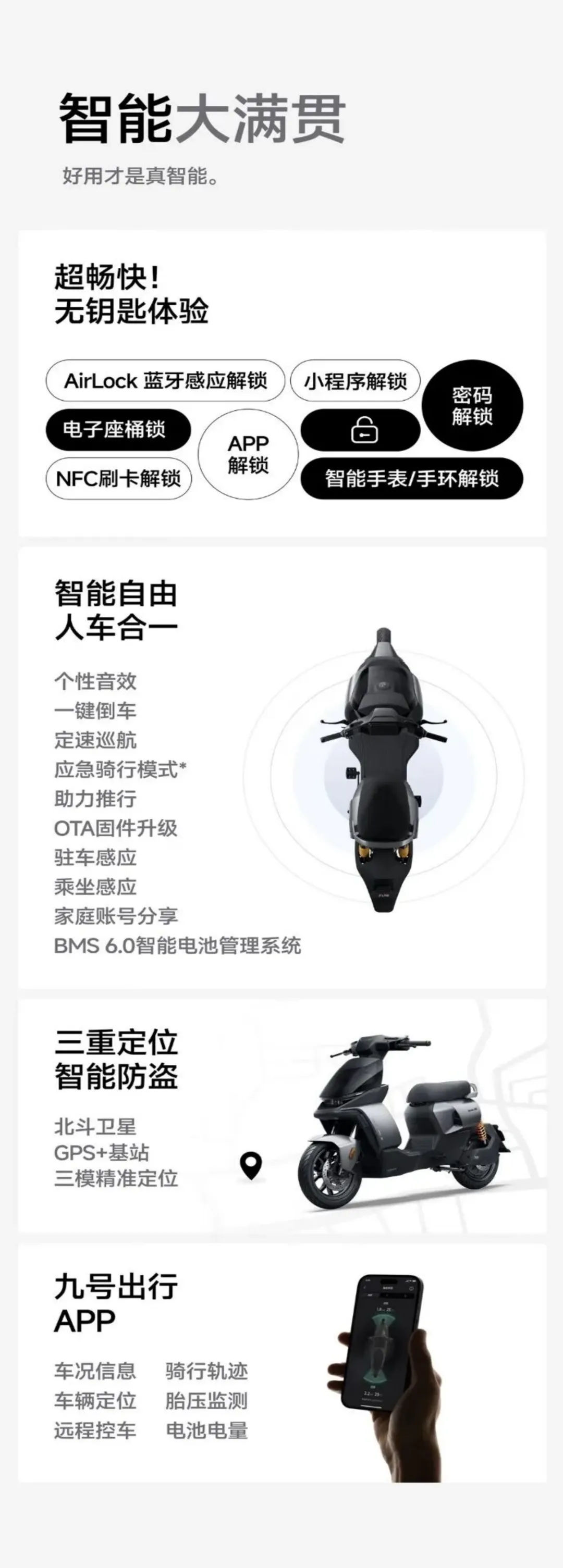 以Mmax2系列中机械师Mmax2 130p为例,该车在智能化配置上搭载18项功能,具备北斗卫星、GPS+基站三重精准定位,可智能防盗、AHRS姿态感应防盗、黑匣子+事故主动求救、远程开关机+控车、驻车感应2.0、乘坐感应2.0、BMS 6.0智能电池管理系统等。用户可通过“九号出行”App查看车况信息、车辆定位、骑行轨迹等。