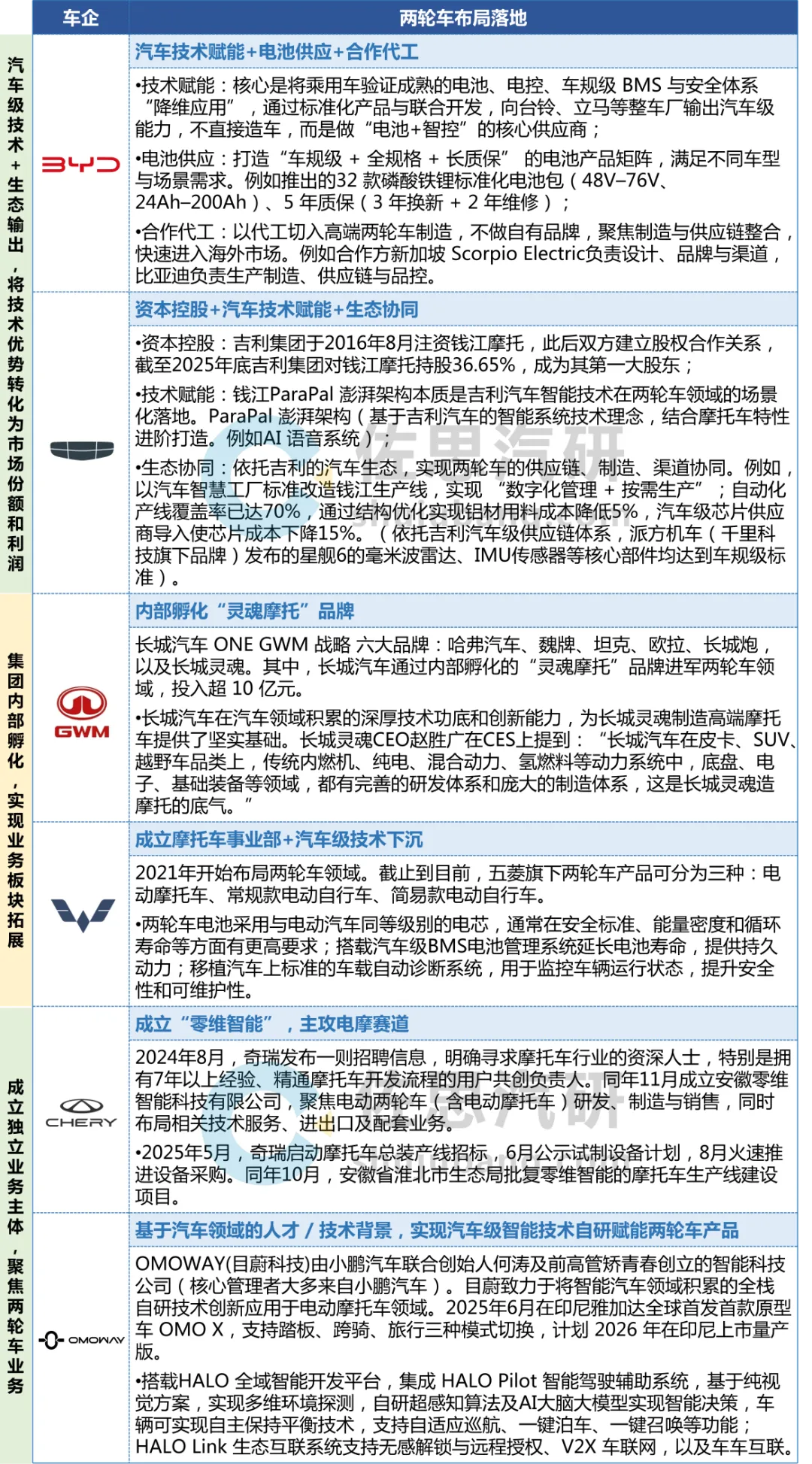 报告中对进军两轮车领域的汽车厂商布局路线进行梳理可划分为以下几种:
