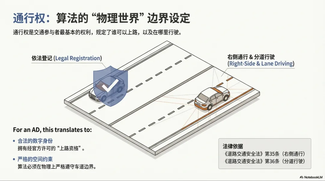 通行权(Passage Right):最基本的准入底座。法律规定,车辆必须经依法登记且符合技术标准方可上路,并坚持右侧通行和分道行驶。对于自动驾驶车辆(AD),这不仅意味着合法的“身份”,更要求算法必须在物理空间上严格遵守机动车道、非机动车道与人行道的边界。