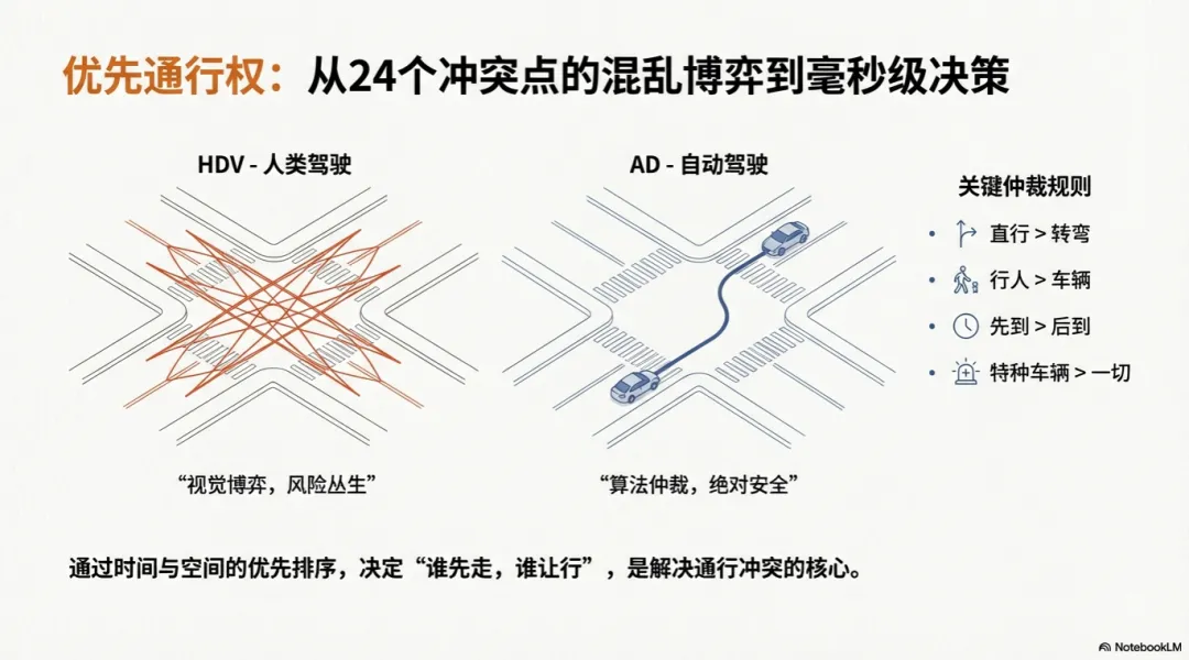 💡 理解路权演化的小比喻:传统的路权分配像是一场没有指挥家的交响乐,乐手们(HDV)盯着彼此的动作小心翼翼地切入;而自动驾驶与协同驾驶下的路权,则是一份精密编排的数字化曲谱。即使乐手增加数倍,在“协同算法”的指挥下,每一辆车都能在准确的时空节点演奏出最流畅的通行旋律。