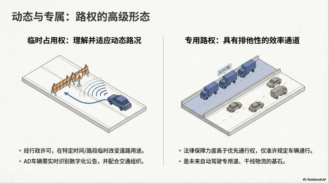 临时占用权(Temporary Occupation Right):动态环境的博弈能力。这是一种静态路权的临时变更,通常因施工或大型活动产生,需经行政审批并提前公告。AD车辆需具备实时识别数字化公告并配合交通组织措施的能力。