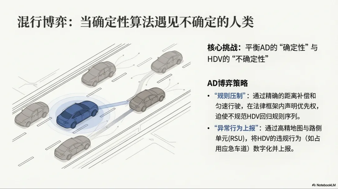 - 博弈策略: 法律规定,机动车在没有划分车道的道路上应在中间通行。AD车辆通过传感器精确定义“中间”位置,通过物理占位引导HDV形成有序的通行习惯。