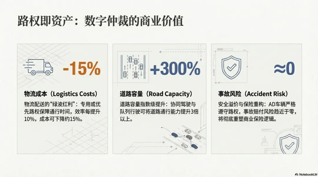 - 颗粒度精细化: 路权将不再是整条车道,而是精准到秒和厘米的“时空碎片”。通过协同驾驶,车辆可以实现极小间距的队列行驶,将道路容量提升3倍以上。