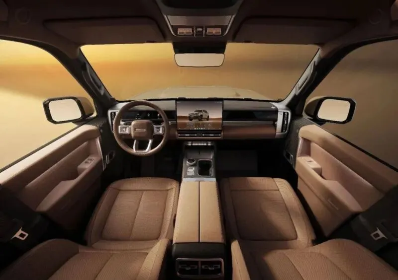 iCaur V27保留了经典的越野SUV设计。外观方面,新车采用了经典的方正方形越野SUV设计,圆形大灯,传统车门把手,翼子板上的黑色装饰细节,垂直排列的尾灯,侧铰链尾门,以及外置备胎。