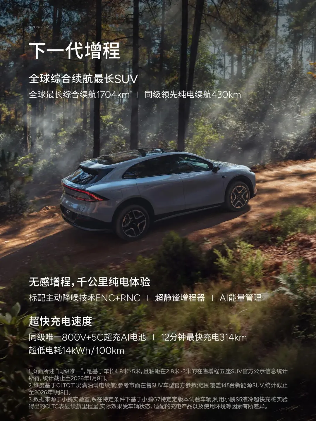 1月8日,小鹏汽车正式推出了2026款小鹏G7,首次推出了“超级增程”版本,增程纯电同价,全系车型官方指导价19.58万元至20.58万元。