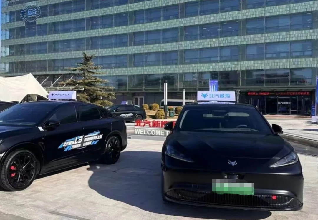 1月10日,在北汽新能源汽车技术创新中心门口,陈列着多辆挂有L3级有条件自动驾驶车辆专用号牌的极狐阿尔法S(L3版),车身侧面贴有“北汽极狐L3自动驾驶率先上路”的标语。