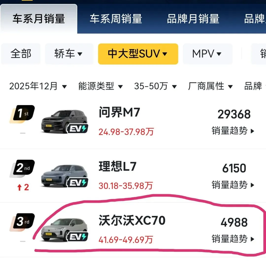 按照12月份的销量数据看,沃尔沃XC70卖出了4988台,从这个品牌的电车影响力来看,单月卖出这么多真的十分优秀了,毕竟沃尔沃旗下已经很久没有这么好的销量了。按照中大型SUV销量排行看,甚至已经是第三名的位置,很让人惊喜。