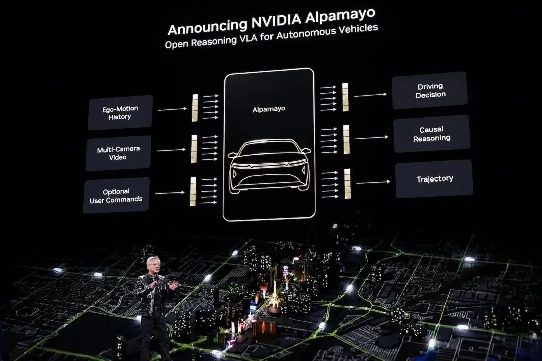 [图片 1] 英伟达 CEO 黄仁勋发布 Alpamayo图注:黄仁勋在 CES 2026 舞台上展示 Alpamayo 的架构。屏幕显示,该模型接收“自身运动历史”、“多摄像头视频”甚至“用户指令”作为输入,经过中间的 Alpamayo 大脑处理,输出“驾驶决策”、“因果推断”和“轨迹”。
