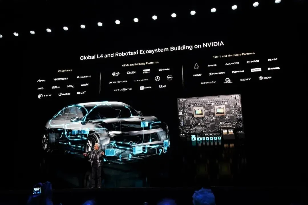 [图片 2] 英伟达展示自动驾驶生态系统图注:PPT 展示了基于 NVIDIA 构建的全球 L4 和 Robotaxi 生态系统。除了奔驰和 Uber,我们还能看到电装、小马智行、Zoox 等行业巨头的 Logo。