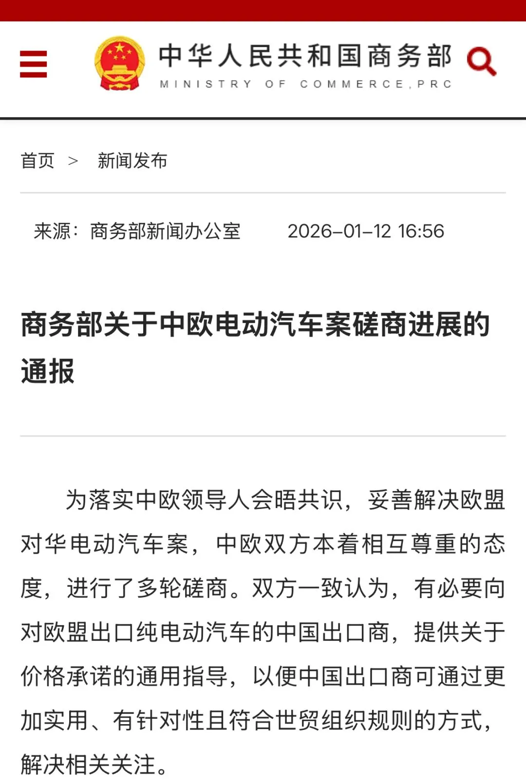 今天下午,商务部就中欧电动汽车反补贴案磋商最新进展发布通报。