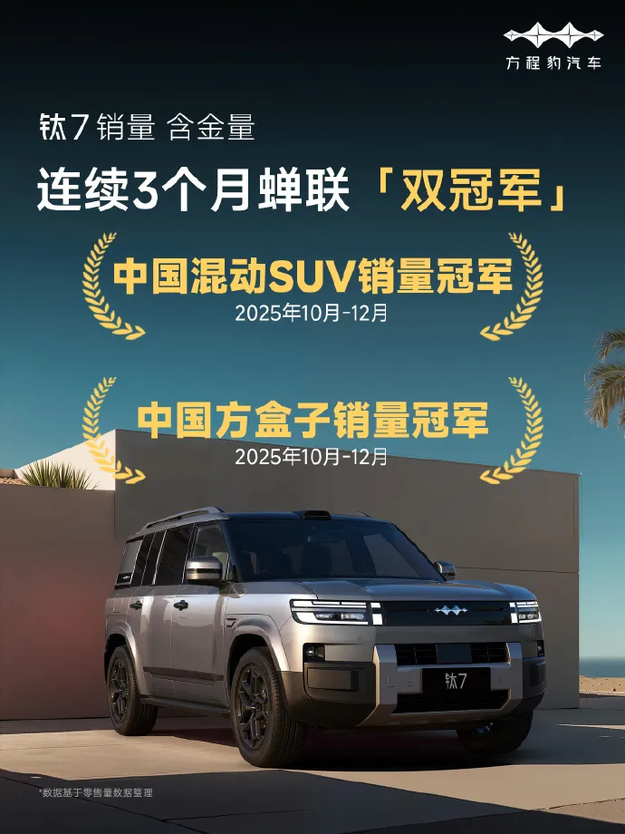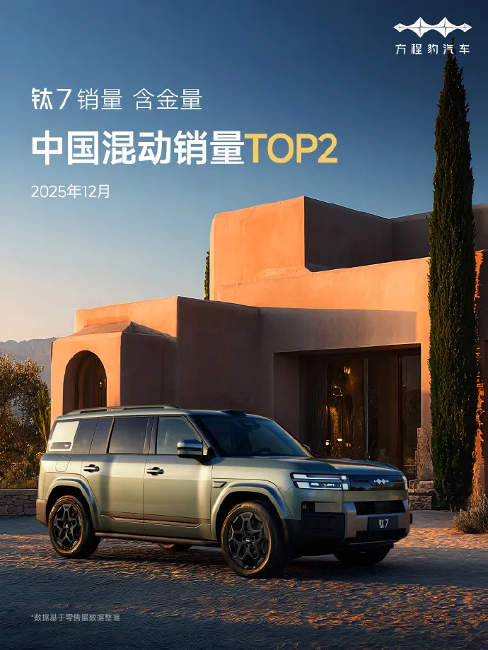 在刚刚过去的 12 月,中国混动 SUV 市场交出了一份极具代表性的成绩单:方程豹钛 7 登顶中国混动 SUV 销量 TOP1。这个结果看似是一次“单月冠军”,但放在整个中国汽车产业加速新能源转型的大背景下,它更像是一枚清晰的信号——混动 SUV 的主导权,正在发生实质性的转移。