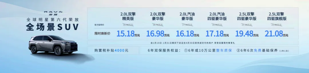 #全新荣放 限时焕新价15.18-21.08万元,1月10日-1月31日下定且4月30日前完成交付的用户可获4000元购置税补贴与6年双保服务。