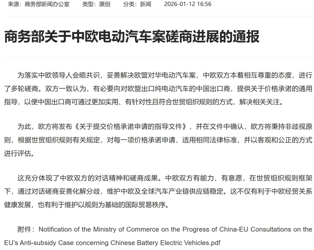 2026年1月12日,商务部通报中欧就电动汽车案磋商进展,欧盟同意发布《关于提交价格承诺申请的指导文件》,为对欧出口纯电动汽车的中国出口商提供指导,以此代替原来的高关税壁垒。