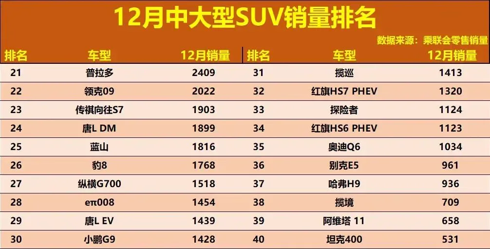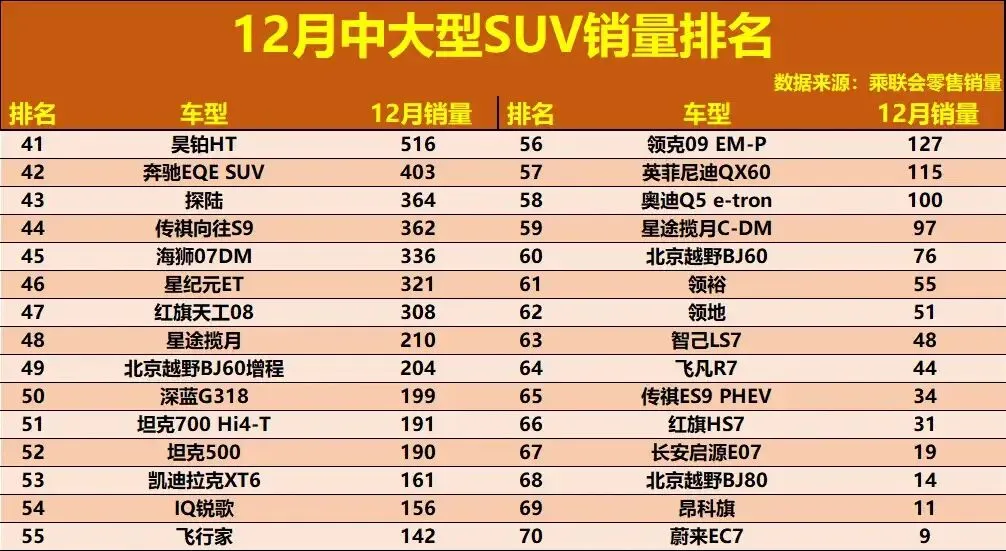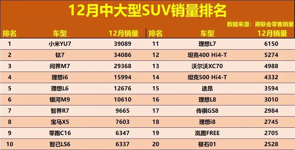 中大型SUV市场大洗牌!12月销量榜:新能源车霸屏前四,问界M7稳居季军