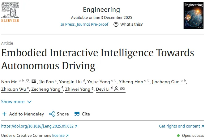 近日,清华大学李德毅和北京工业大学马楠作为通讯作者在中国工程院院刊《Engineering》期刊上发表“无人驾驶具身交互智能”的研究论文,提出了无人驾驶具身交互智能理论框架,通过跨媒体感知、机器学习、认知计算和生成式人工智能等技术,构建与物理世界统一的智能表达与学习方法。