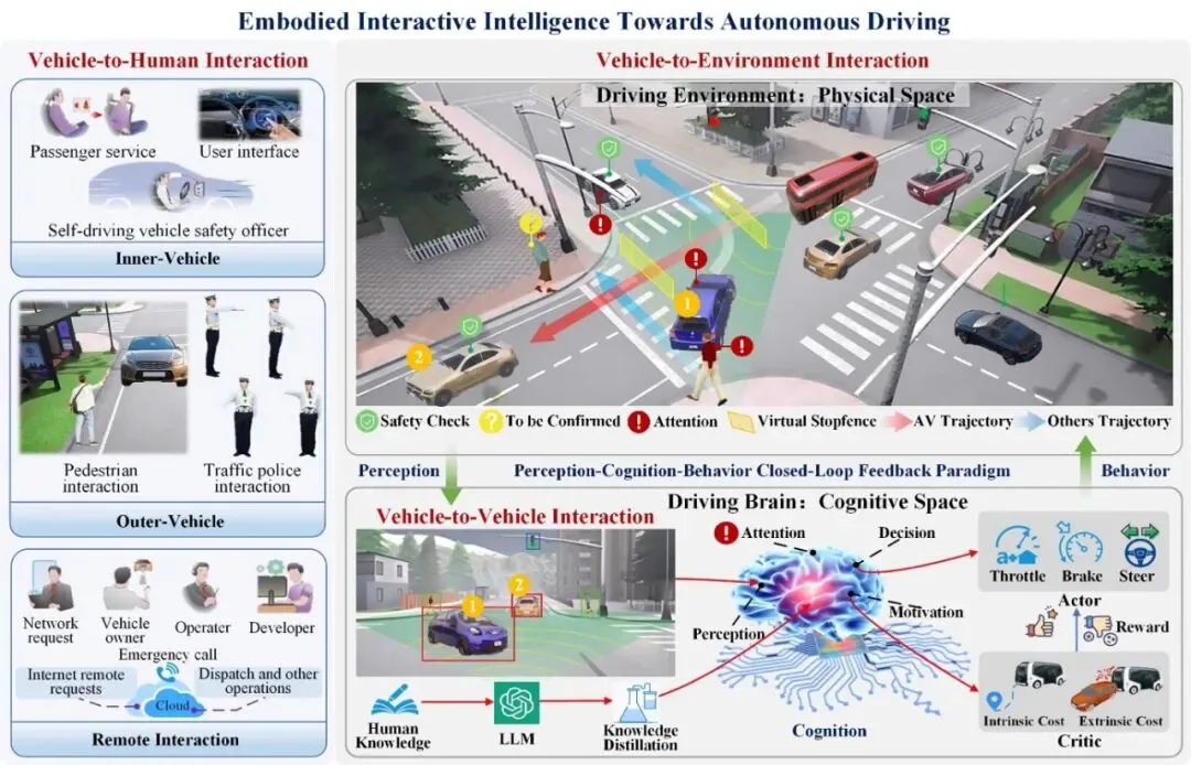 该框架的核心思想是:无人车如同一个置身于交通环境中的智能体,它利用跨模态感知系统识别物理世界的关键要素,并通过主动与环境交互来获取反馈。基于此,它持续构建并优化物理世界与自身认知世界的映射关系,最终形成“感知-认知-行为”的闭环范式,实现近似人类的决策与控制能力。
