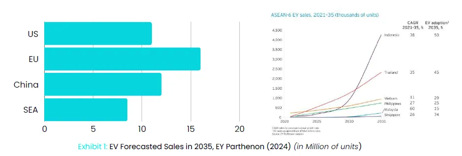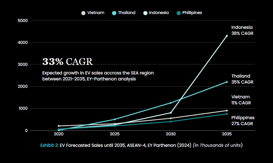 在同一份报告中,安永帕特农公司预测,从 2021 年到 2035 年,东南亚地区的电动汽车总销量将以 33%的复合年增长率增长。这意味着到 2035 年,该地区的销量将达到 850 万辆。