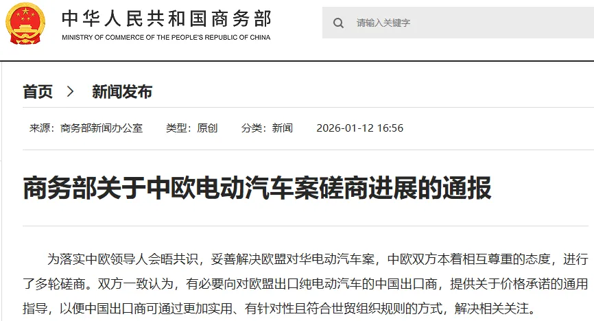 电动知家消息,2026年1月12日,中国商务部官网通报了中欧电动汽车案的最新磋商进展。通报指出,为落实中欧领导人会晤共识,妥善解决欧盟对华电动汽车案,中欧双方进行了多轮磋商,并达成重要共识。欧方将发布《关于提交价格承诺申请的指导文件》,中国电动汽车企业可依据指导文件内容提交价格承诺申请,符合条件的企业可用价格承诺替代反补贴征税。
