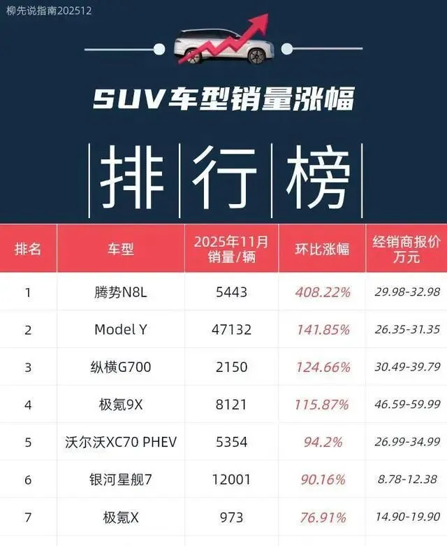 腾势N8L环比暴涨408%,银河星舰7狂飙90%,特斯拉Model Y依然高挂榜二。