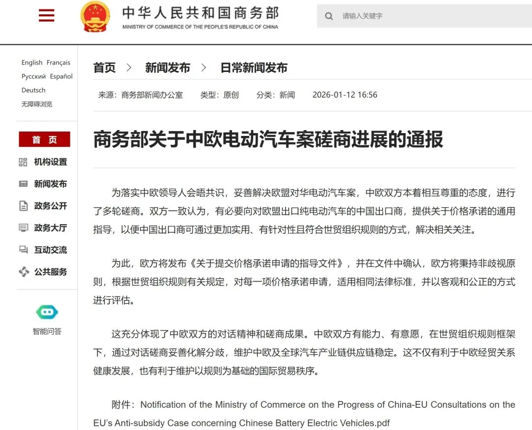 1、1月12日,商务部通报中欧电动汽车案磋商进展:双方同意为对欧出口纯电动车的中国出口商提供价格承诺通用指导,欧方将发布相关指导文件并承诺秉持非歧视、客观公正原则进行评估;