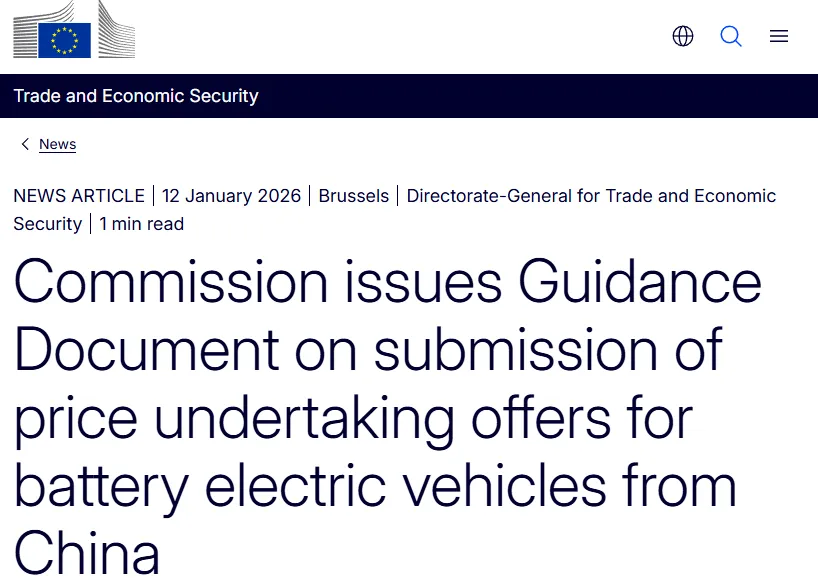 欧盟委员会周一(1月12日)公布了一份一般性指导意见。文件显示,中国电动汽车制造商可以作出最低价格承诺——即为出口欧盟的电动车设定最低价格,以抵消政府补贴。就是说,最低进口价格机制将取代关税。 新华社报道援引中国机电产品进出口商会有关负责人指出,这意味着经过多轮磋商,案件实现“软着陆”。