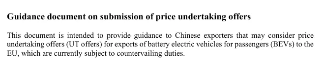 欧盟贸易发言人奥洛夫·吉尔(Olof Gill)表示,该文件“旨在为那些因受到反补贴关税影响而可能考虑提交价格承诺的中国电动车出口商提供指导”。中国商务部对欧盟的指导性文件表示欢迎,称其“充分体现了中欧双方的对话精神和磋商成果”;这不仅有利于中欧经贸关系健康发展,也有利于维护以规则为基础的国际贸易秩序。