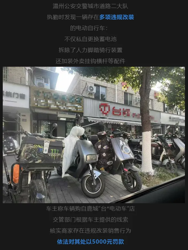 日前在温州公安交警的执法案例中,一辆存在多项违规改装的电动自行车被查获。这辆车不仅私自更换蓄电池,拆除了人力脚踏骑行装置,还加装了外卖挂钩横杆等配件。